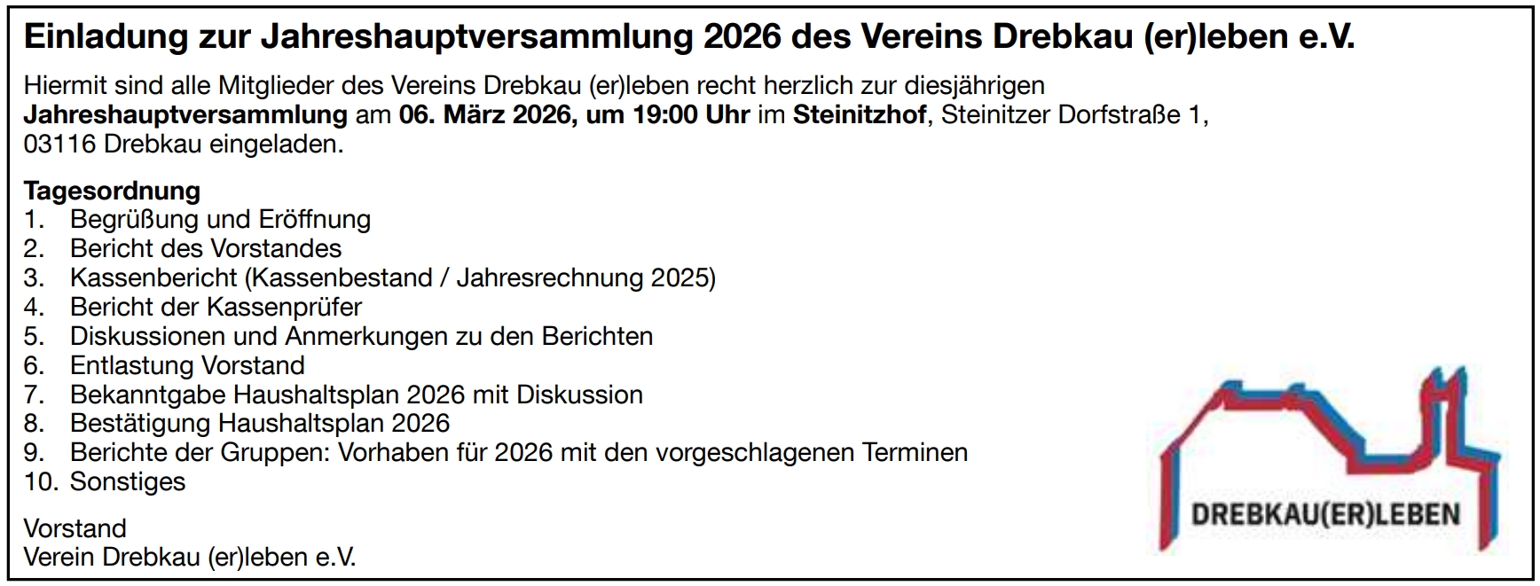 Einladung zur Jahreshauptversammlung 2026 des Vereins Drebkau (er)leben e.V.